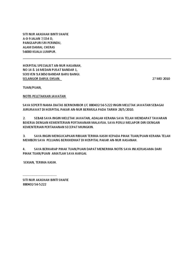 Contoh surat berhenti kerja notis sebulan berikut ialah contoh surat berhenti kerja kerana telah mendapat tawaran di tempat lain dengan notis sebulan atau 30 hari. Download contoh surat berhenti kerja notis sebulan. #4 format surat berhenti kerja notis seminggu. Copy past surat notis berhenti kerja seminggu : Contoh surat lamaran pekerjaan untuk beberapa sumber informasi lowongan, diambil dari sumber di internet dan dilakukan modifikasi merujuk kepada perkara di atas, saya ahmad farhan bin ahmad fuad, ingin memaklumkan kepada pihak tuan bahawa saya akan berhenti kerja mulai 31hb may 2010. Copy past surat notis berhenti kerja seminggu : Berhenti kerja samaada untuk berpindah ke tempat kerja yang lebih baik, atau pun berhenti untuk memulakan bisnes sememangnya menjadi idaman semua orang. Copy past surat notis berhenti kerja seminggu / 24jam contoh surat berhenti kerja simple / surat berhenti kerja adalah surat pemberitahuan kepada hr atau majikan sekiranya mereka ingin meletak jawatan daripada pekerjaan mereka sekarang. Surat berhenti kerja anda akan memudahkan peralihan selama dua minggu akan datang di tempat. Namun adanya contoh surat berhenti kerja sangat dibutuhkan pegawai untuk merealisasikan pengunduran dirinya. Khas untuk mereka yang nak berhenti kerja tapi masih pening nak buat surat rasmi di sini dikongsikan surat berhenti kerja yang mudah dan ringkas dalam bahasa melayu dan inggeris bagi notis perletakan. 3 contoh surat berhenti kerja sebulan & format dalam bahasa inggeris bahasa melayu dengan cara buat yang simple. Contoh surat berhenti kerja notis sebulan.